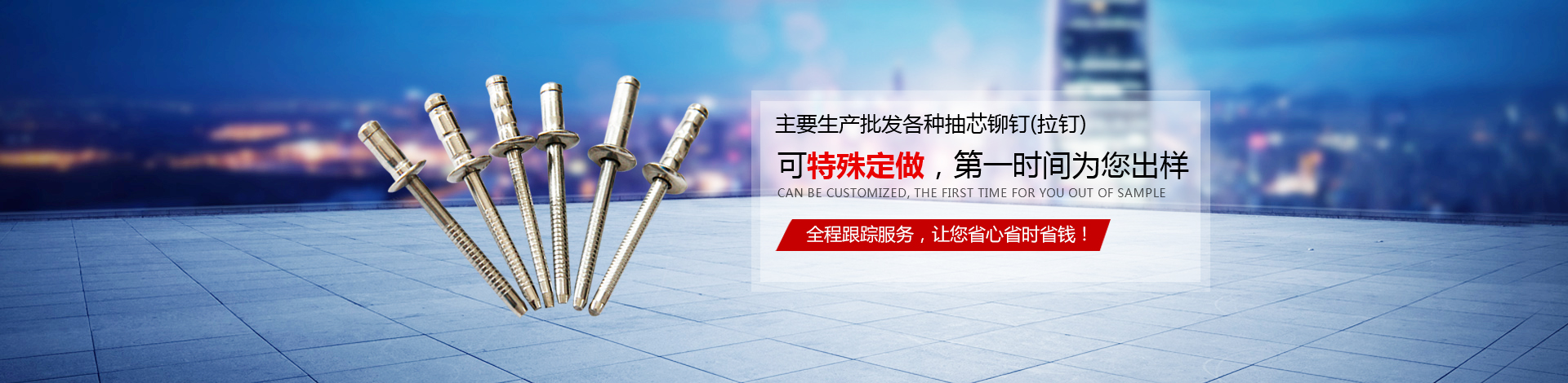 我們主要產(chǎn)品有:2.4-6.4的圓頭,沉頭(平頭),開口,封閉系列抽芯鉚釘(拉釘),還有燈籠鉚釘,拉絲鉚釘,雙鼓型鉚釘,拉花型鉚釘?shù)鹊冉Y(jié)構(gòu)性鉚釘,材質(zhì)有鋁,不銹鋼,鐵,銅;還有M3-M12的平頭,沉頭,小頭系列鉚螺母,有圓桿型、帶槽型、六角型(半六角)、盲孔型等,材質(zhì)有鋁,不銹鋼,鐵,銅。